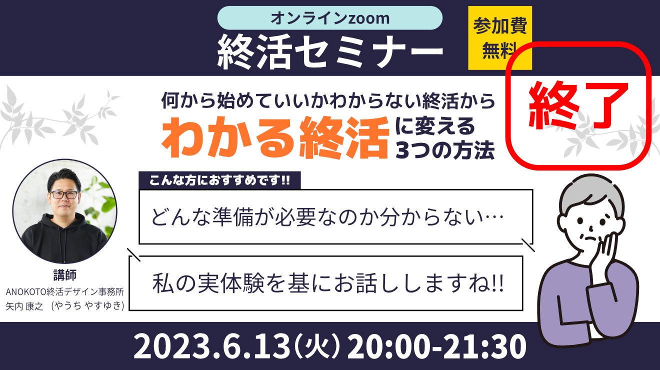 | セミナー名 | 何から始めていいか『わからない終活』を『わかる終活』に変える3つの方法 |